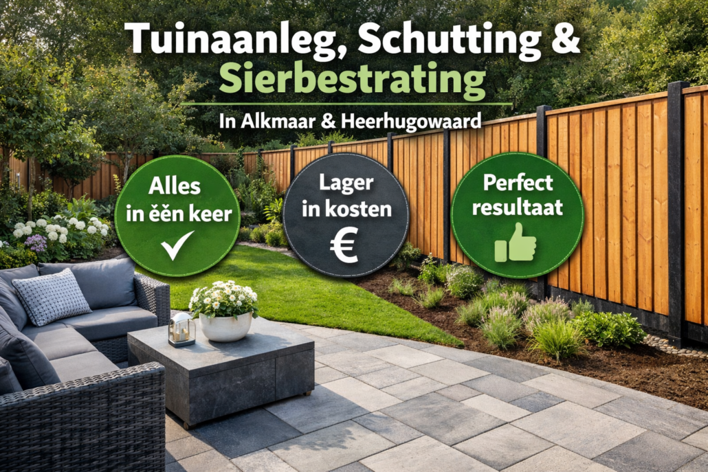 In de praktijk zien wij bij tuinaanleg in Alkmaar en Heerhugowaard dat het juist veel slimmer, mooier én goedkoper is om schutting plaatsen, sierbestrating aanleggen en de volledige tuinaanleg in één plan mee te nemen.